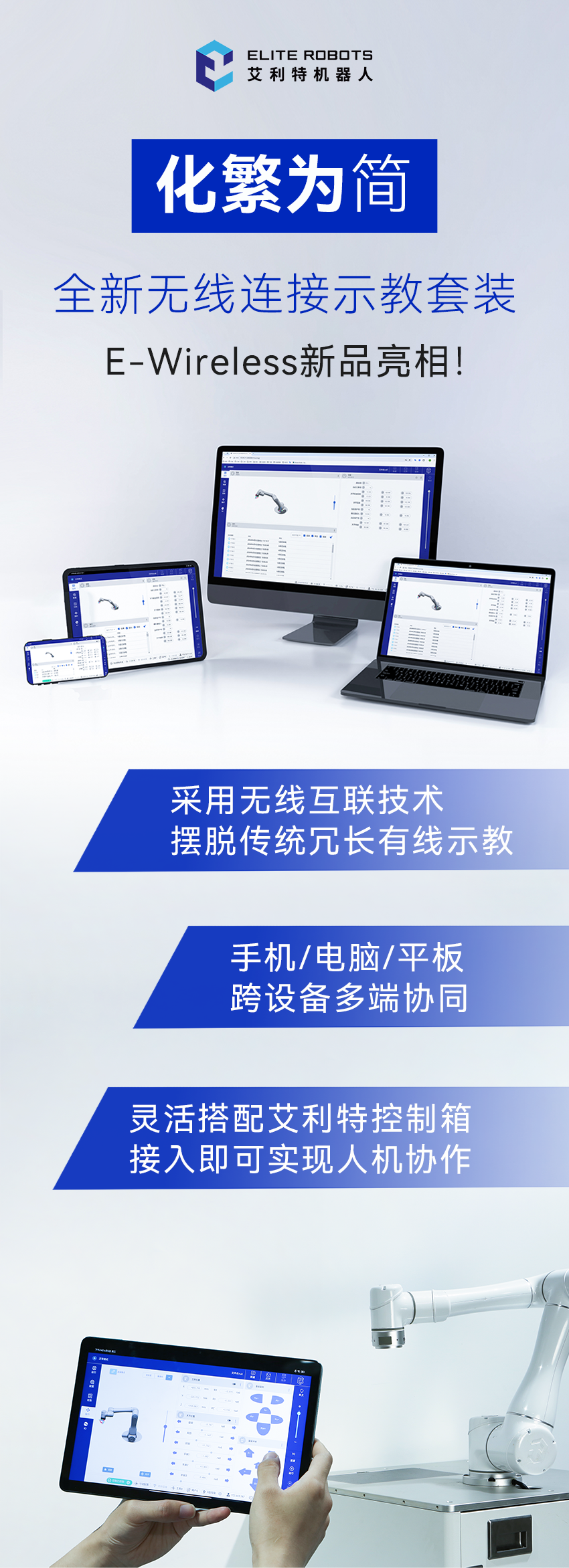 E-Wireless无线套装产品,支持手机/电脑/pad跨设备多端协同,基于浏览器的WebUI示教软件,可满足用户2个核心诉求: