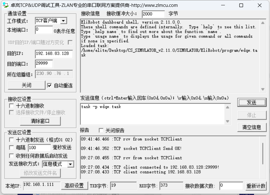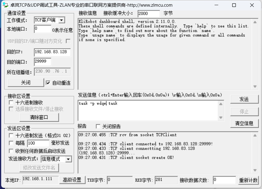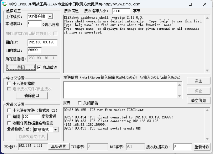 以 socket 助手为例,只需要知道机器人的 ip,端口填写 29999。连接成功后机器人返回如下数据: