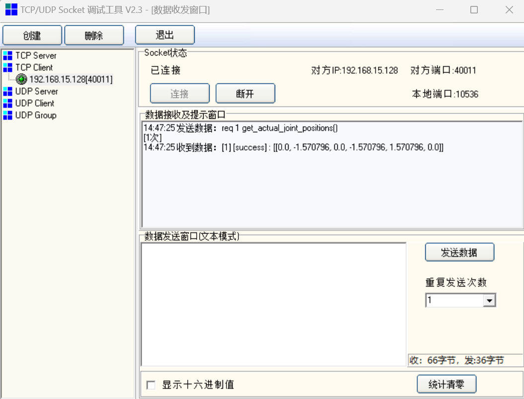 使用socket tool等工具,连接机器人40011端口,进行测试。