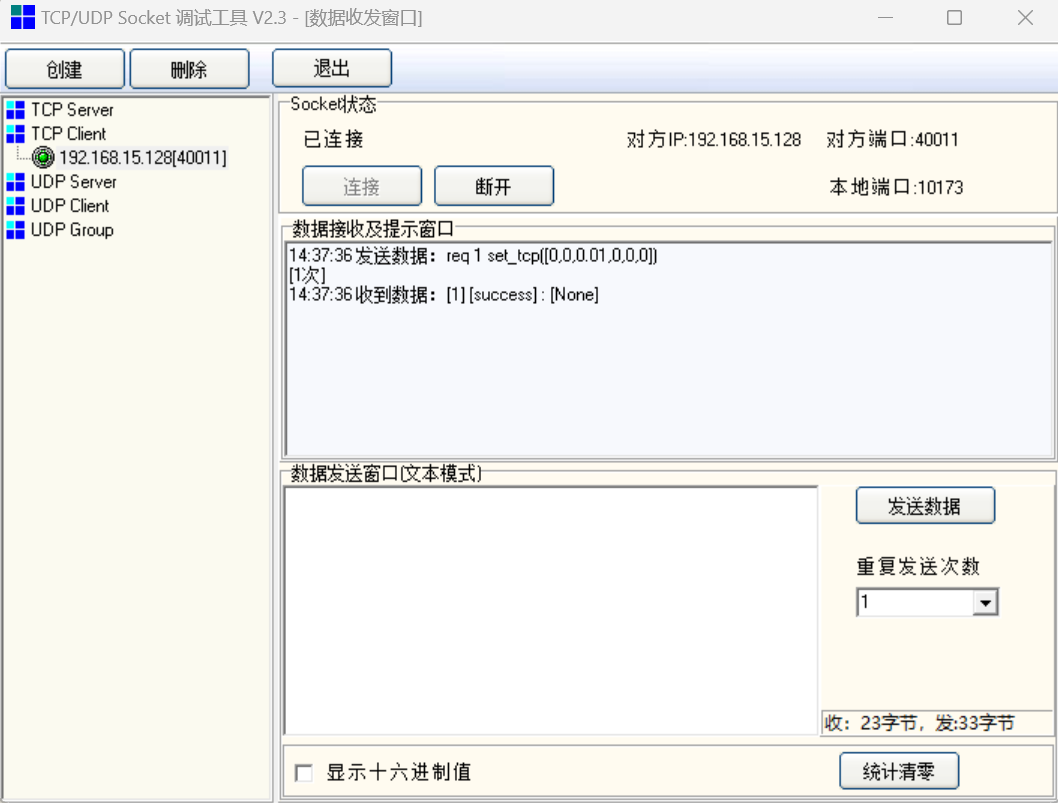 使用通讯助手创建客户端,连接机器人40011端口,设置TCP参数