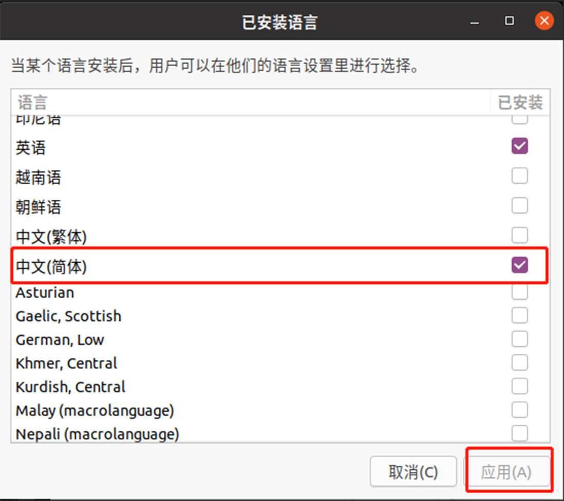 弹出“已安装语言”窗口,勾选中文(简体),点击应用 验证码:elibot