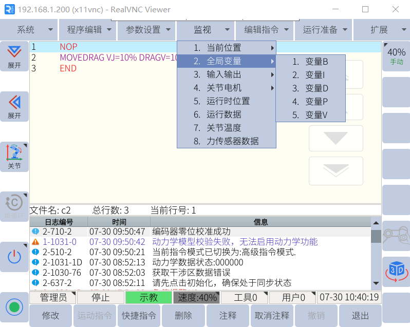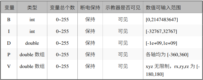 如表格所示,艾利特机器人全局变量分为五种均可通过 jbi 和 lua 进行操作,通常使用情况下,会使用 B、I、D 变量进行 逻辑的交互和简单数据的传递,而 P 变量用作放置关节数据,V 变量用作放置笛卡尔数据。 P 变量和 V 变量存放对应的数据后,可以使用示教器手动移动到目标位置,或者通过移动指令 直接到指定的位置。
