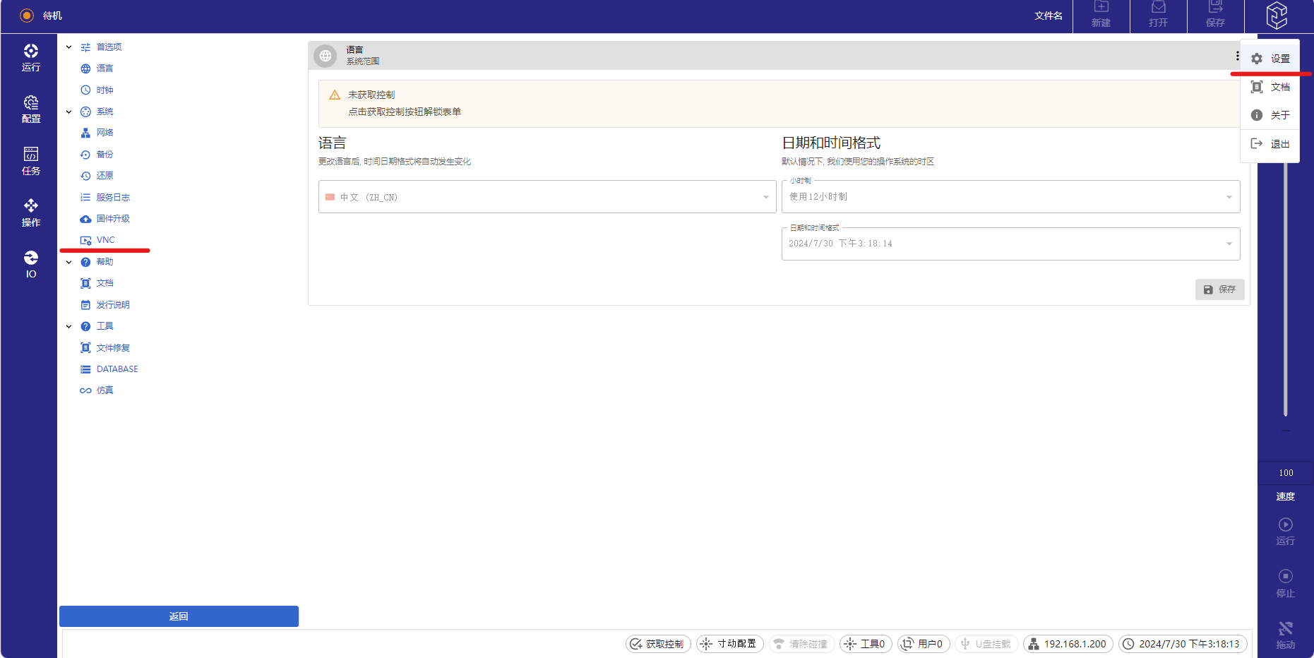 3.12及以上版本开始支持全新的网页示教器,其功能更丰富,若还想在网页示教器使用VNC功能按照如下步骤: 先点击右上角艾利特logo,点击设置,再点击VNC即可进入