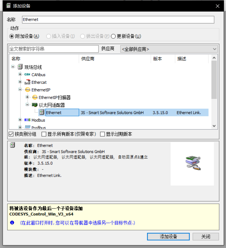 选择现场总线--EthernetIP--以太网适配器--Ethernet,点击右下角添加设备
