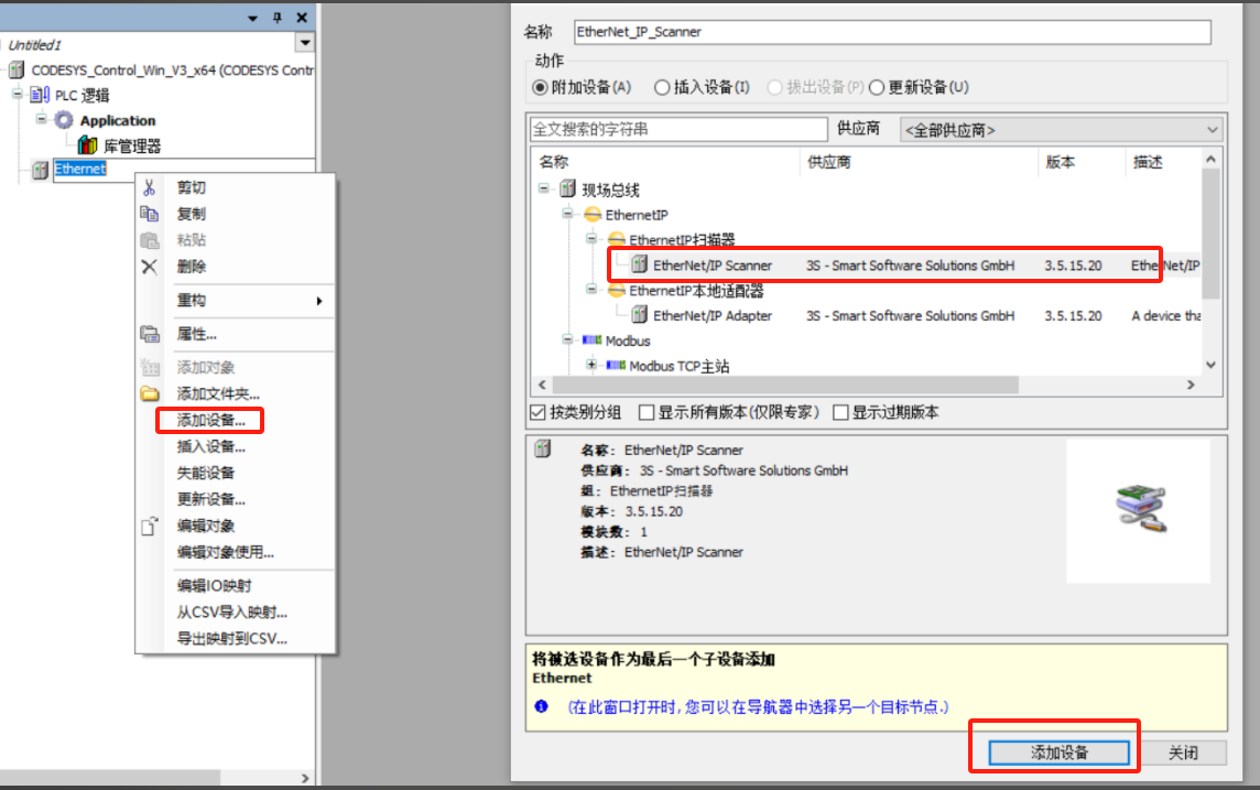 选择新建设备 Untitled1,右键点击添加设备,选择对应的 CODESYS Control Win V3 X64 中的 PLC,点击添加设备