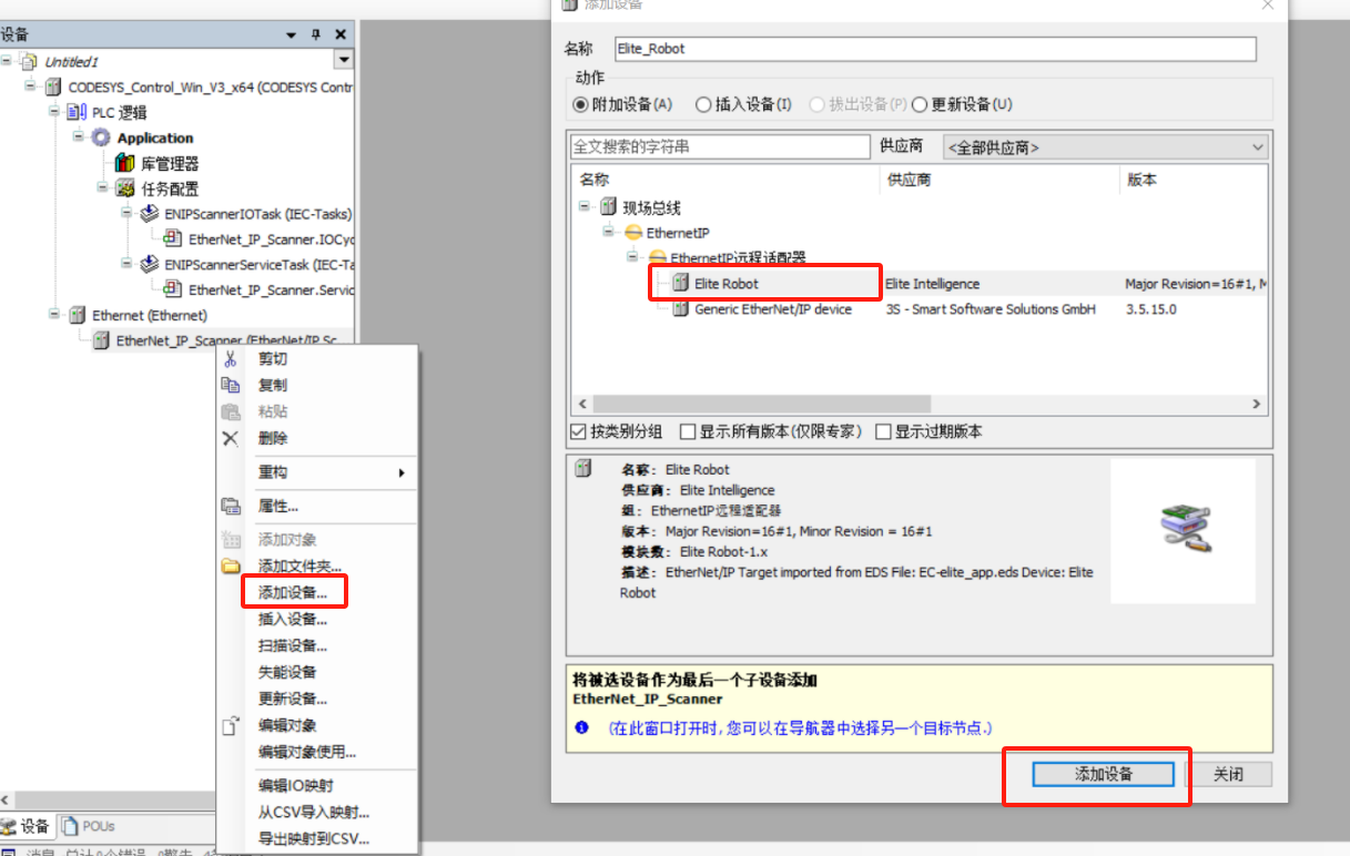 选择 Ethernet/IP Scanner,点击右键选择添加设备,选择 Elite Robot,点击右下角添加设备