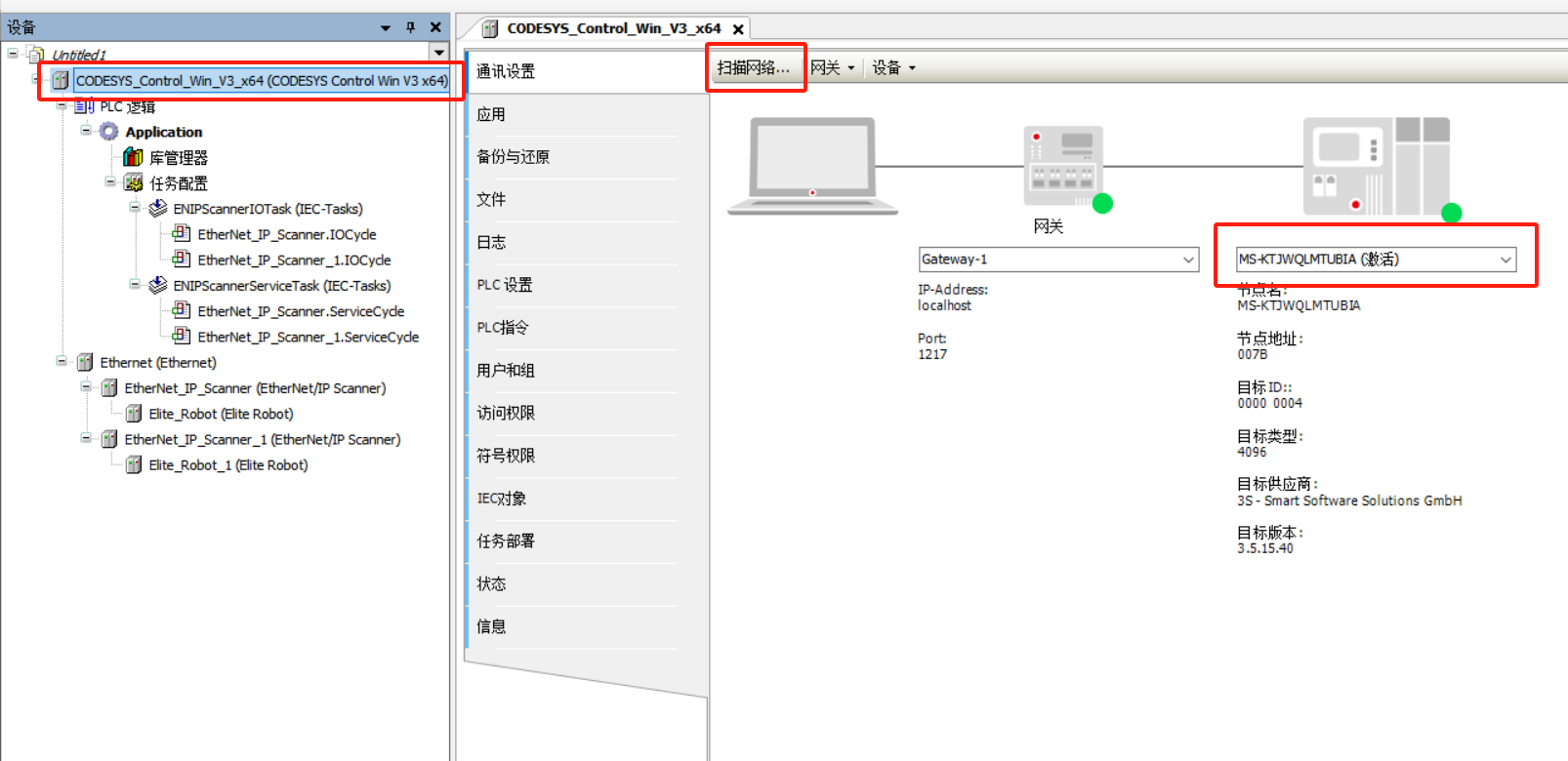 双击 CODESYS Control Win V3 X86 设备,进入通讯设置,选择对应电脑名称,扫描设备