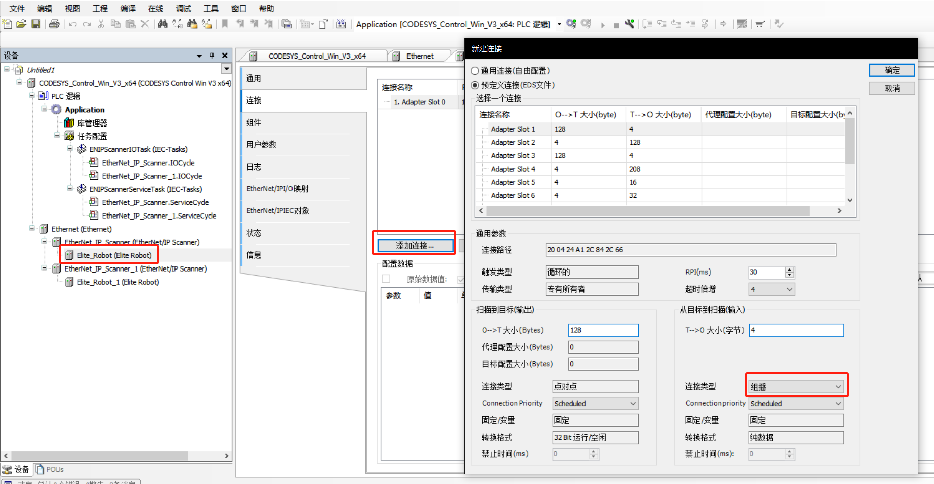 选择 Elite Robot 模块进行配置,选择连接,根据需要添加连接,这里连接 Adapter Slot 0、1、2、3、4、9、10,包含 INT 输入输出寄存器、Float 输入输出寄存器、位置信息寄存器及 M 虚拟输入输出(通讯类型选择组播)
