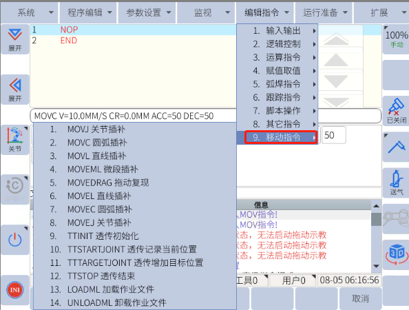 在EC系列机器人编程中,MOV与MOVE作为两种基础运动指令形式,分别对应不同的应用场景: