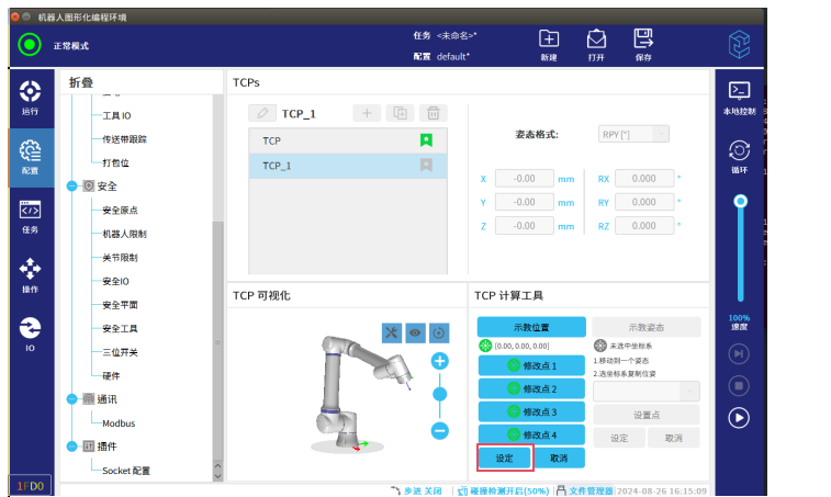 第三步:4个点设置好后,如图-6所示,点击设定,新建的TCP就设置好了。如图-7两个红框标记所示,新建的TCP_1与基座标系方向不同。