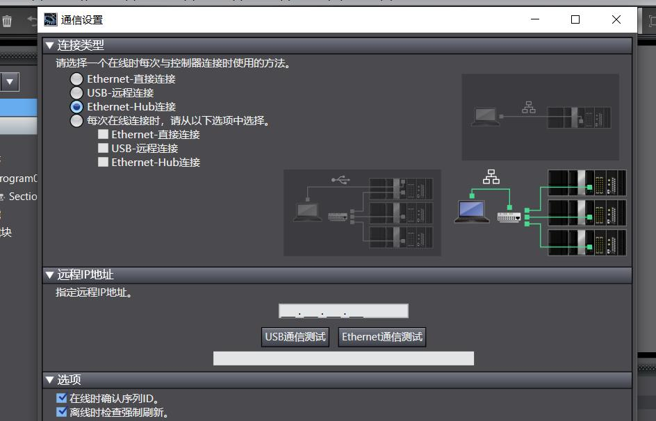 5、选择Ethernet-Hub连接,并设置远程IP地址,设置完成后并保证pc与plc在同一网段,点击Ethernet通讯测试,看看是否连接成功。(欧姆龙plc初始ip192.168.250.1)