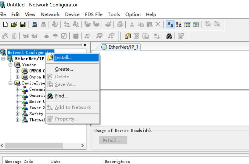2、 首先打开Network,这个软件可以帮我们看到适配器插槽对应变量的大小,以及目标变量,右击左边栏Network Configurator图标,选择install,找到对应的EDS文件