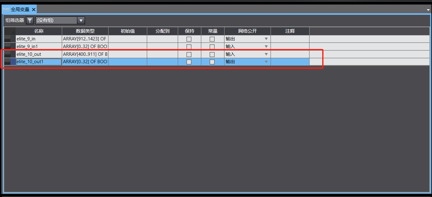 11、 续创建插槽 10,点击空白处,新建全局变量在数据类型中填入 ARRAY[400..911] OF BOOL,网络公开设置成输入状态,再次创建所需输出,点击空白处,新建全局变量,在数据 类型中填入ARRAY[0..31] OF BOOL,网络公开设置成输出状态