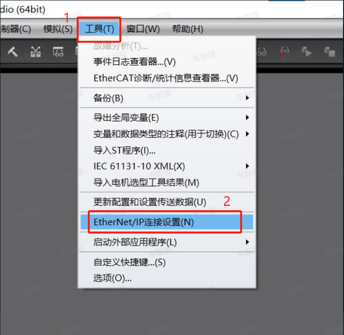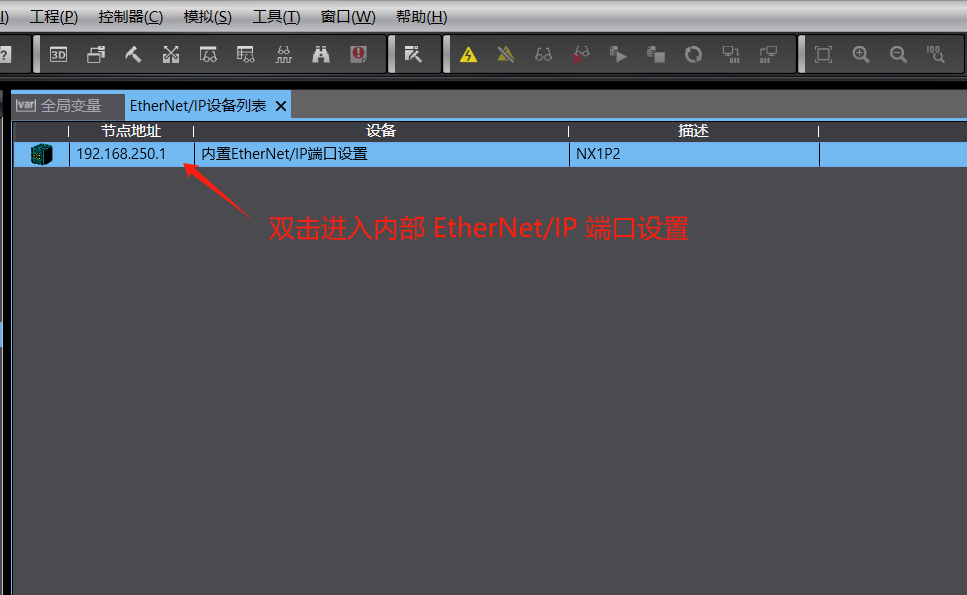 12、 全局变量设置完成后,点击上方栏工具选项,找到 EtherNet/IP 连接设置点击进入