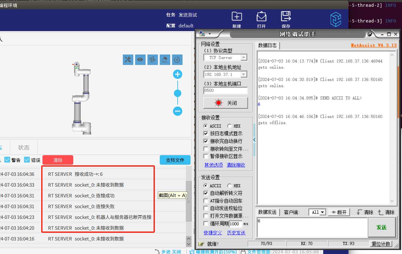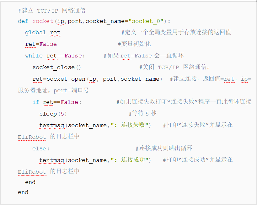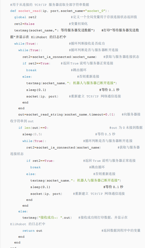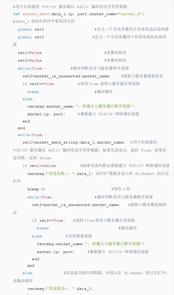 - 以上代码是以发送字符串和读取字符串为例,如果想发送/读取其他数据类型,只需要更换代码中的socket_send_string/socket_read_string即可,具体指令参考CS机器人脚本手册下载中心_机器人技术-艾利特机器人