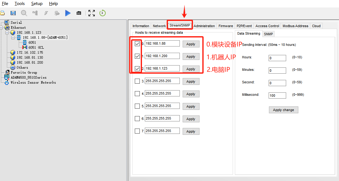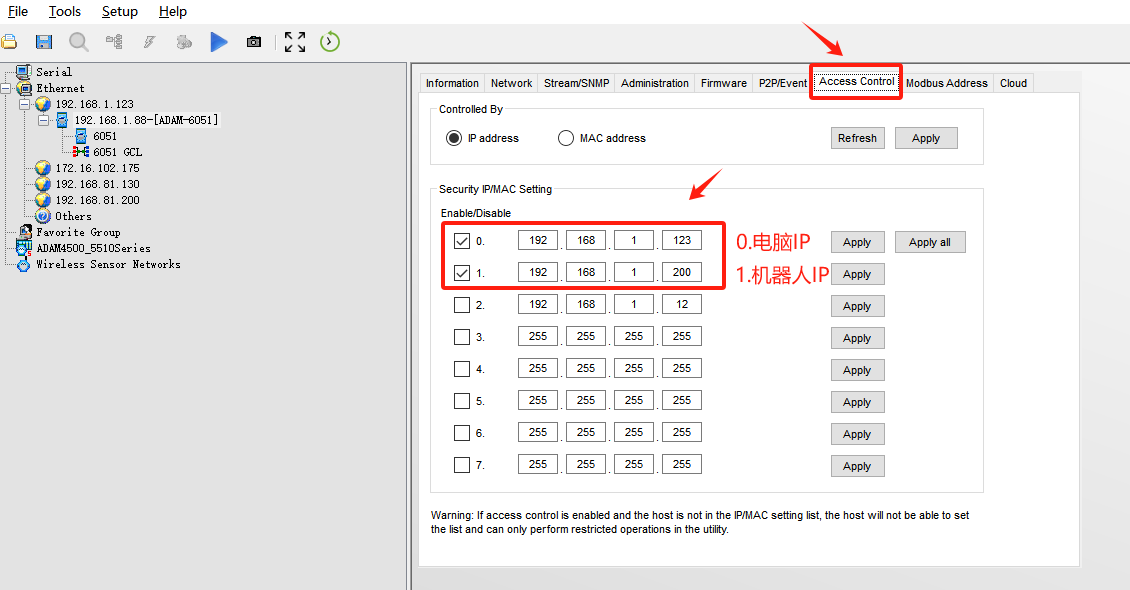 设置完成后点击下图,勾选前面方框,设置能够控制模块的IP地址,设置完成后点击Apply。