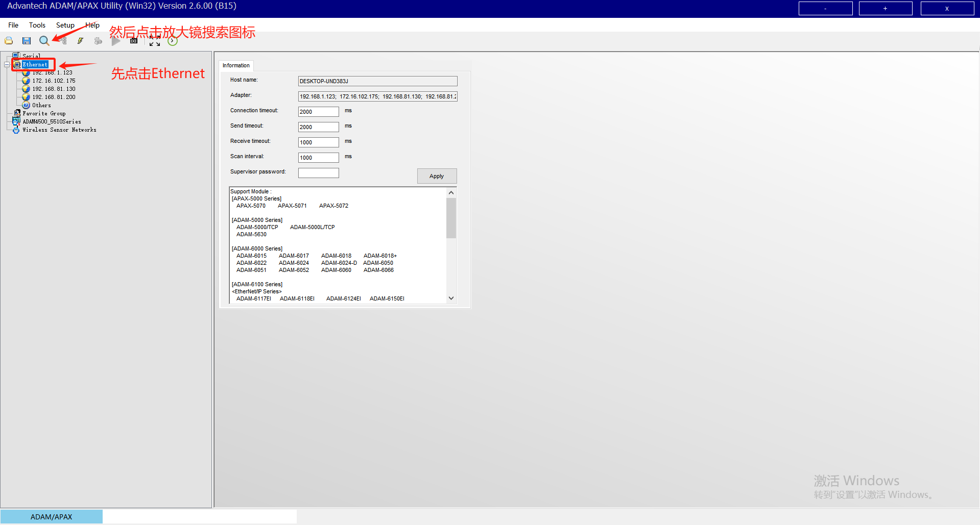 电脑IP与模块的IP设置为同一网段,然后打开软件,按下图操作开始进行