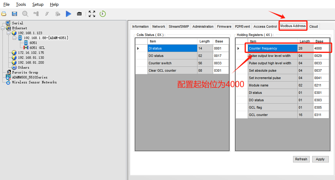 然后配置Modbus Address,把图上的起始位配置成4000.