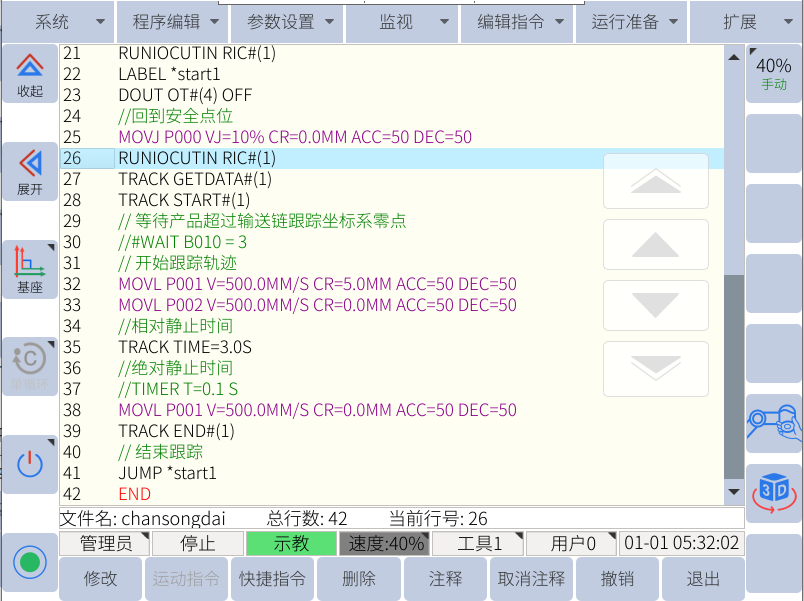 整体标定好后,运行JBI程序,将钥匙旋钮转到PLAY模式,速度要放到100%,才能跟上传送带速度,然后上伺服,启动。