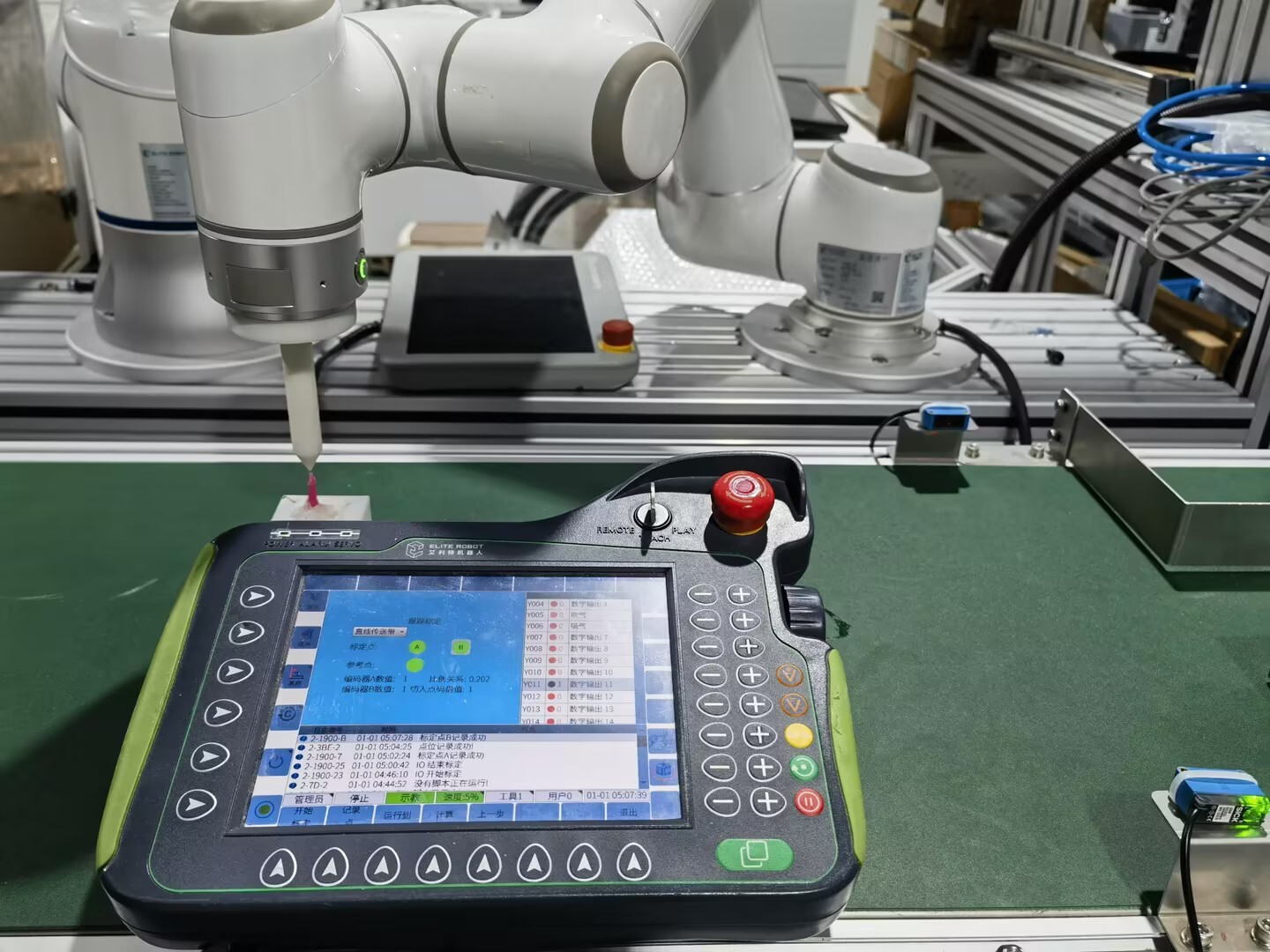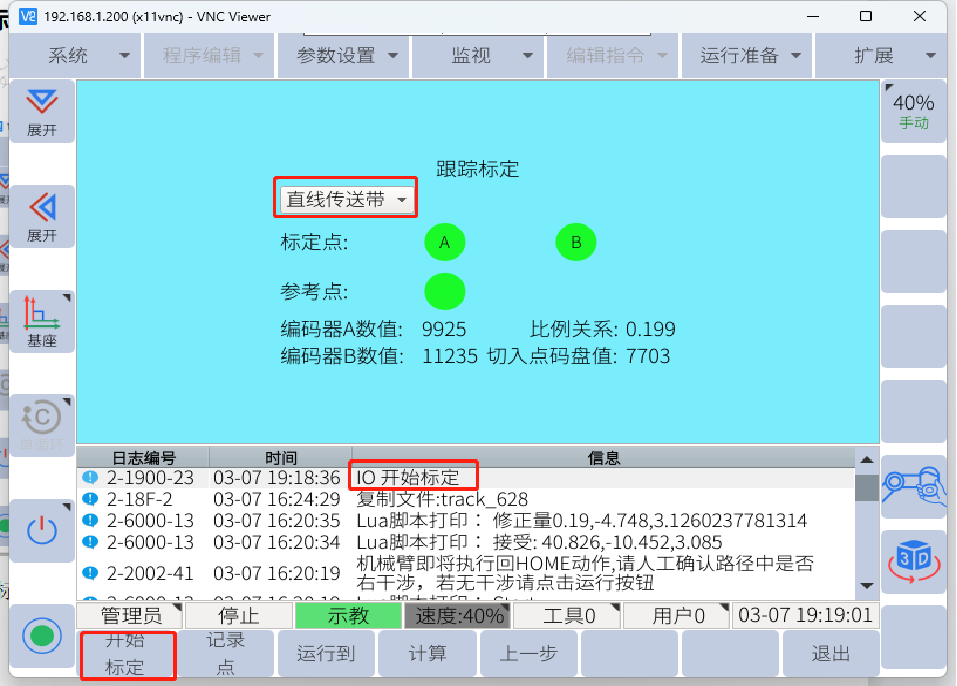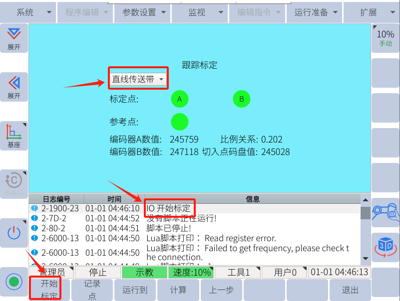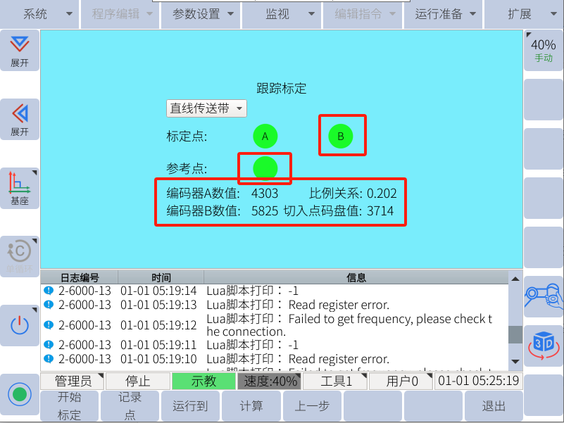 示教完跟踪轨迹后将传送带缓慢开动一段距离后(设定的有效结束距离400mm以内,最优300-350mm),停止传送带运动(传送带速度保持不变),将机械臂移动至B点并记录B点(A点B点需戳向同一个特征点记录),记录A点和B点时,下面会显示编码器数值,