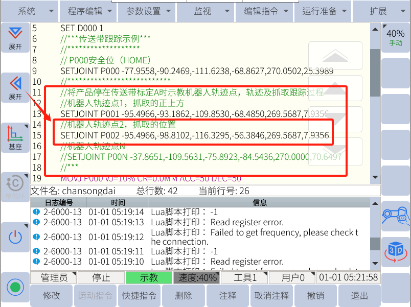 标定步骤:将物品放到传送带上缓慢开动传送带使物品经过传感器(此时日志窗口显示“io标定结束”)到达A点后,停止传送带运动,将机械臂移动尖点至A点并记录A点和程序中的“P002”,此时可以退出标定页面进入程序示教跟踪轨迹(示教图中应避免晃动物品)