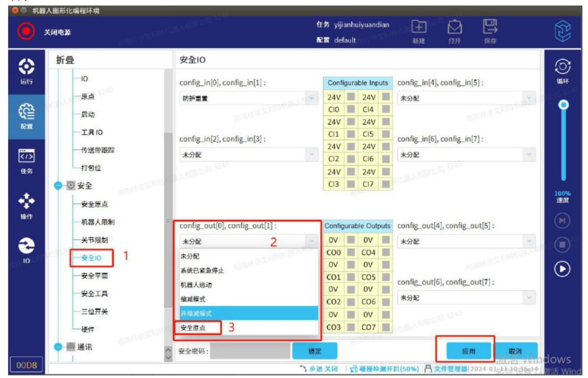 最后在【配置】【安全】【安全 IO】中选择可配置输出 IO,选择其中一组信号,然后配置成需要的安全原点信号,这样就可以机器人处于原点位置时,可以在可配置 IO 输出的端口读到输出信号。