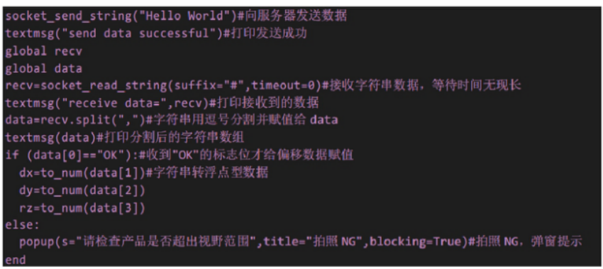 接收视觉坐标脚本程序 receive.script 如下图 6。视觉发过来的数据按照:"OK,1,2,3#"格式,第 1 位数代表标志符,拍照成功发送"OK",拍照失败发送"NG";第 2,3,4 位数分别是 X,Y,RZ 方向的偏移,数据用","隔开,末尾用"#"作为结束符。