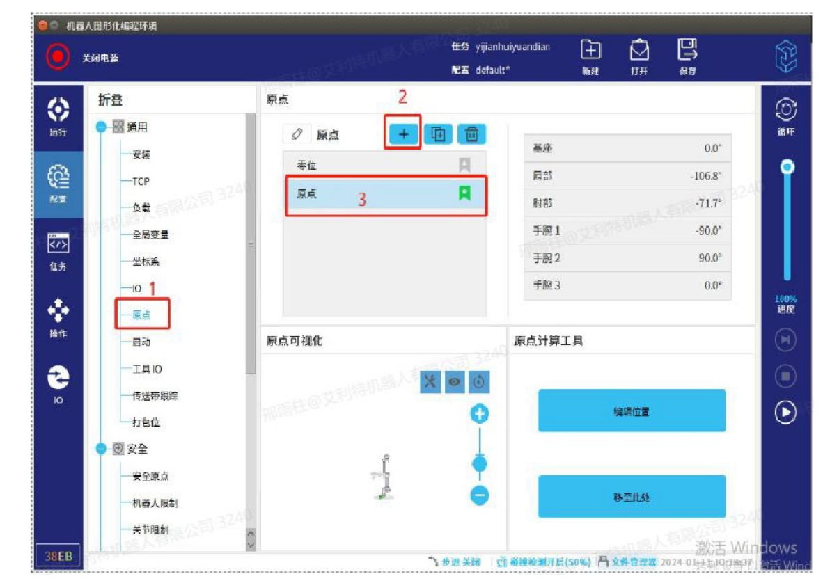 3.1 首先【配置】【通用】里面找到【原点】 置一个机器人原点,根据现场实际情况进行设置,后期修改原点也可直接编辑位置。