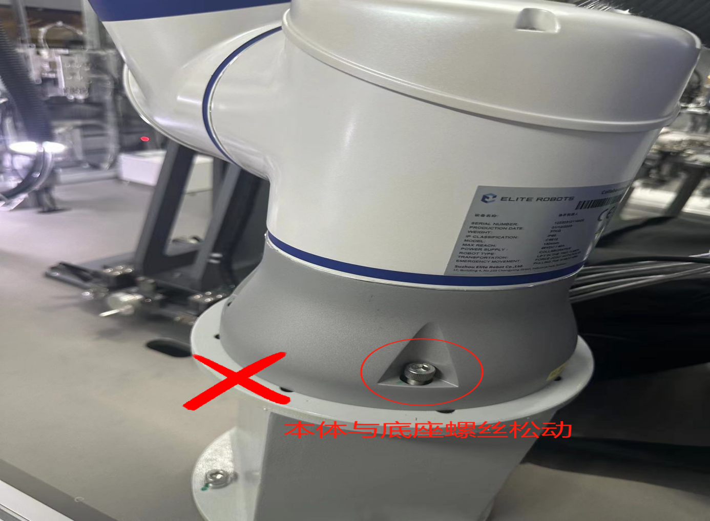 检查机器人本体上的螺丝是否松动或丢失、机器人末端的工具是否有松动,工作台是否本身就抖动,机器人会因为震动而对紧固件产生振动,长时间运动后螺丝可能会松动或者丢失,导致机器人抖动。如图2-1-1所示机器人本体与底座的螺丝松动。