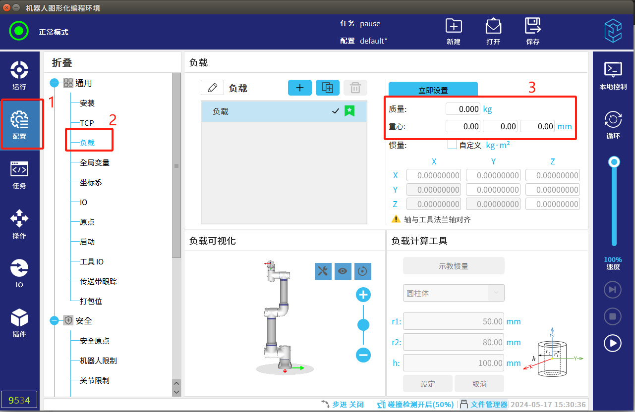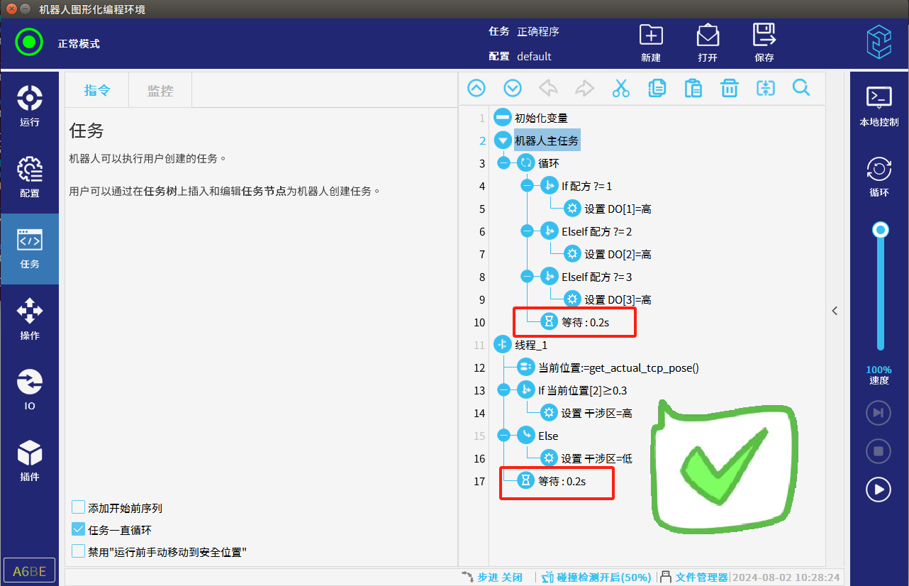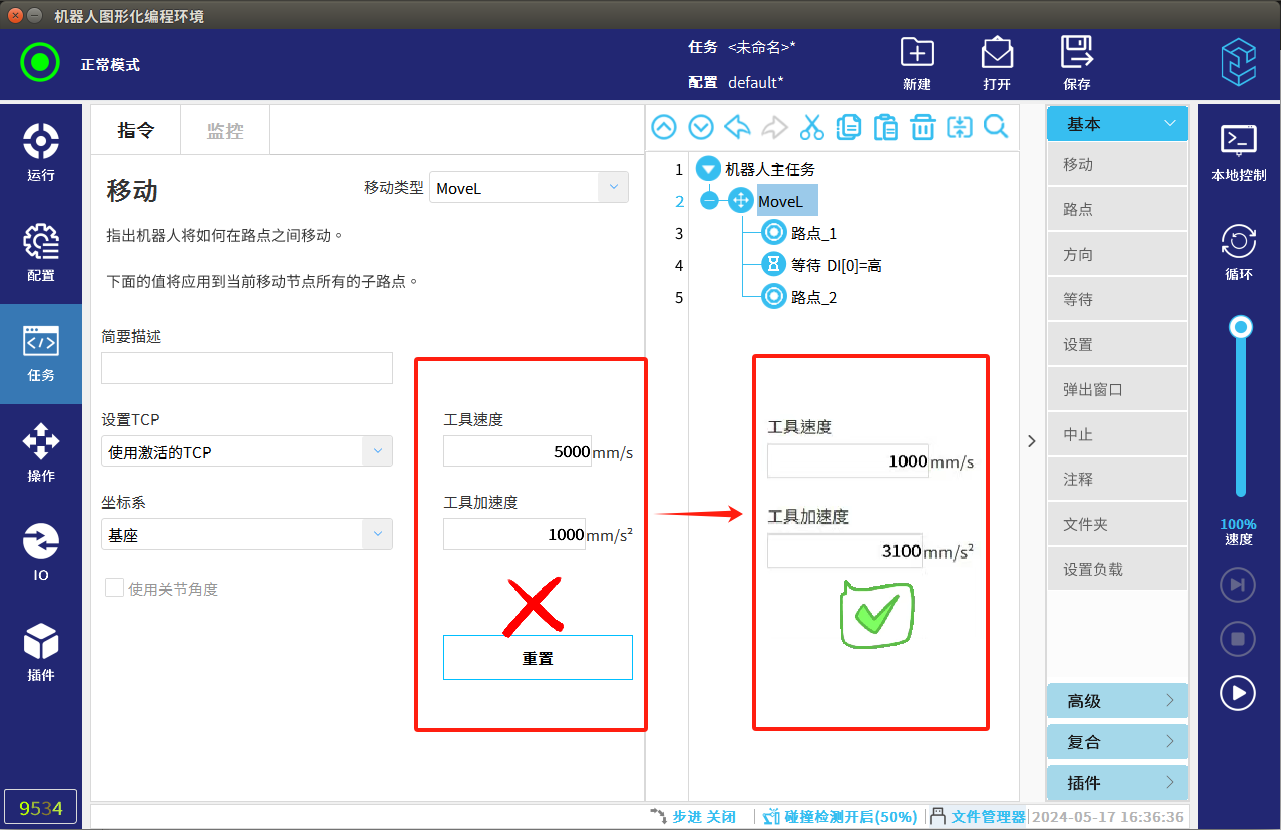 4.调试过程中速度尽量放慢,碰撞检测要打开,避免发生碰撞机器人发生抖动。