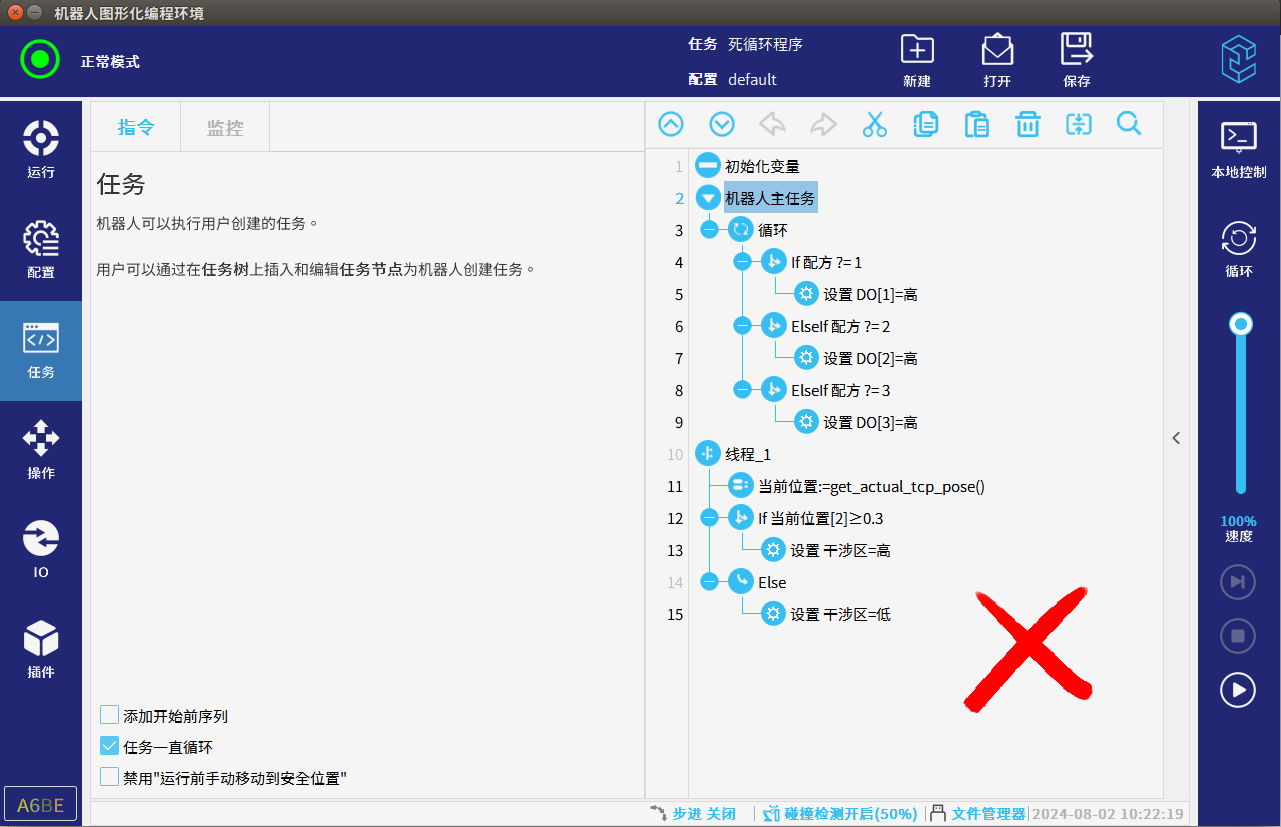 检查程序中是否有死循环会导致机器人CUP过载,CPU过载也会导致机器人抖动,例如程序中一直if循环判断且条件多次不满足的时候程序会进入死循环,使用线程时线程中没有加等待时间程序也会进入死循环如图3-2-1,应该在循环/线程中加等待时间避免出现死循环CPU过载后导致机器人点到点抖动如图3-2-2所示。