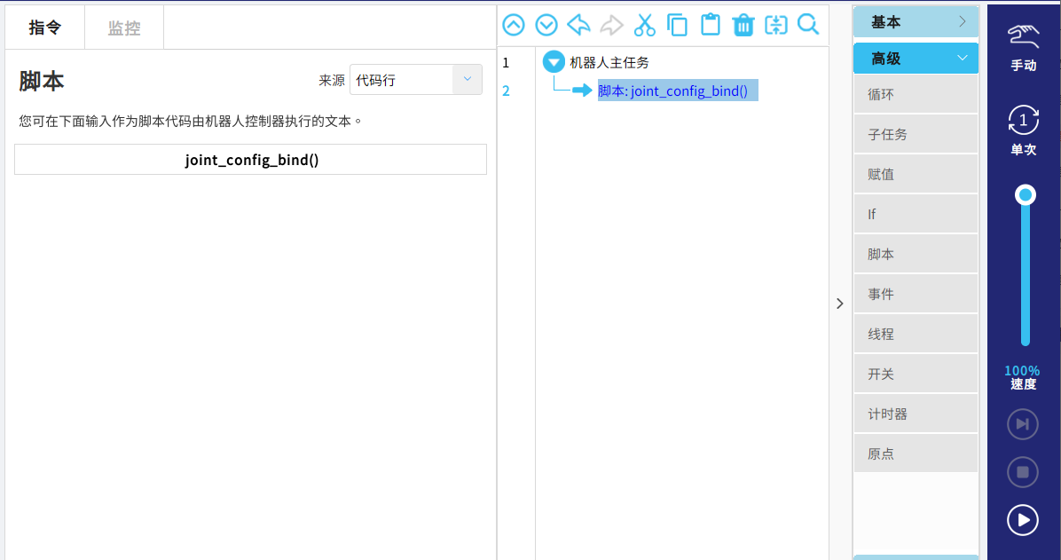 在运行了上述自适应低频抖动抑制功能后,伺服会自动学习一组合适的抑制振动的参数,此时需要单次执行脚本 joint_config_bind()进行数据保存,如图4-2所示,脚本执行完成后可以在 下位机中进行查看,路径为:/rbctrl/eli_robot_data/joint_bind.conf;