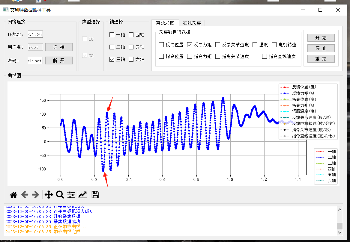 1.通过EliteMain进行数据采集并观察每个轴的转矩波形,当波形中出现 抖动较大的情况时,测量该频率;(EliteMain软件需联系艾利特技术人员获取)