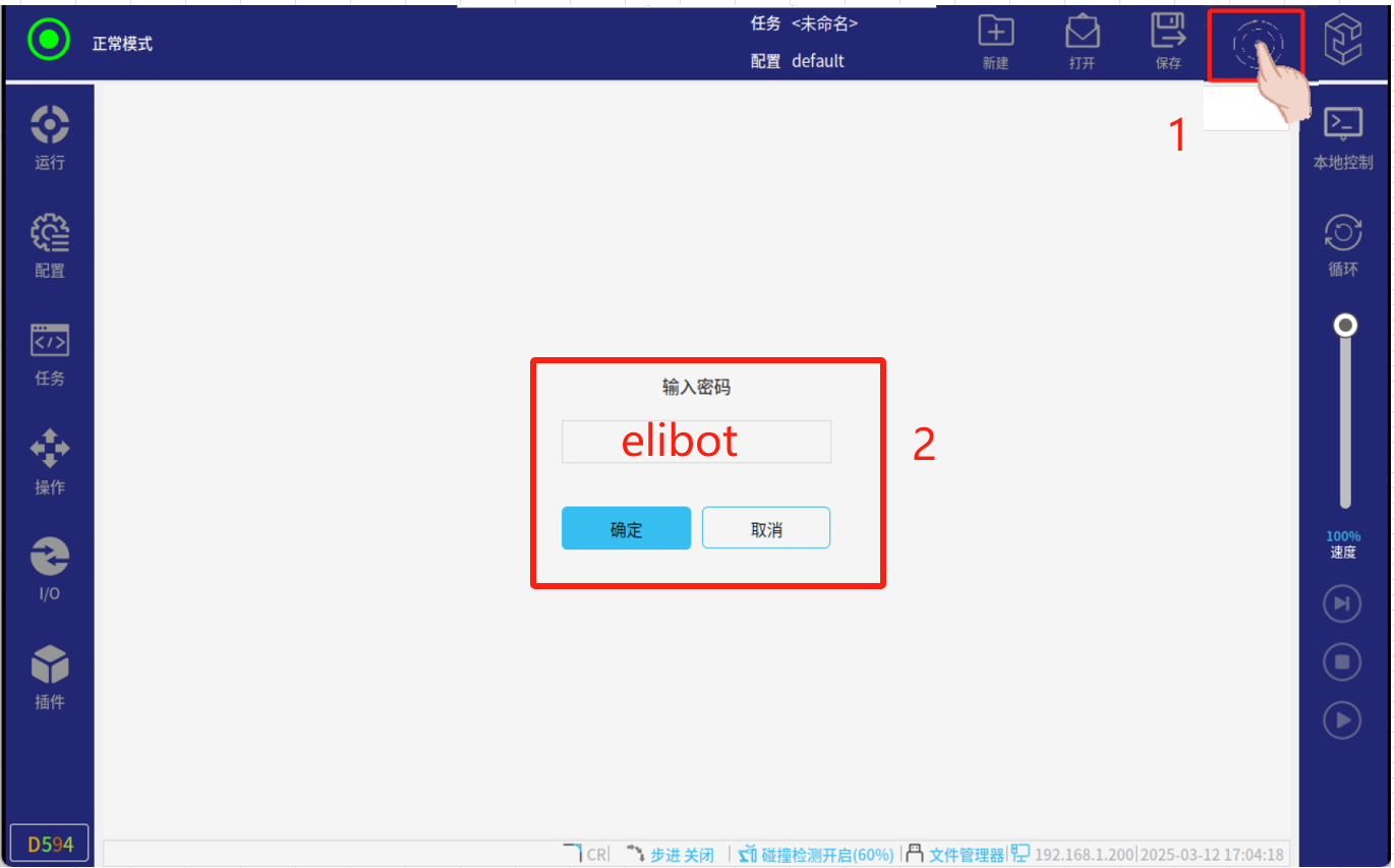 2、在正常模式下点击如图4-1所示右上角红框标注区域(连续快速点击 5-8 次)就会出现输入密码页面界,然后输入密码:elibot,进入专家模式;