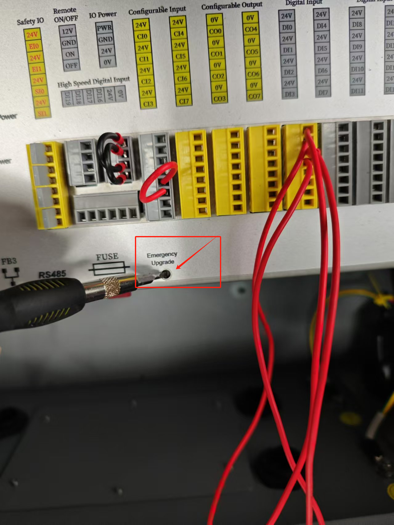 ● 将控制器断电,按住控制柜的上的Emergency Upgrade强制升级按钮的同时点击一次示教器开机按钮(即正常开机动作),不释放Emergency Upgrade按钮,待系统开机后会进入系统升级页面,此时可以进行A9系统升级(.eru文件)。