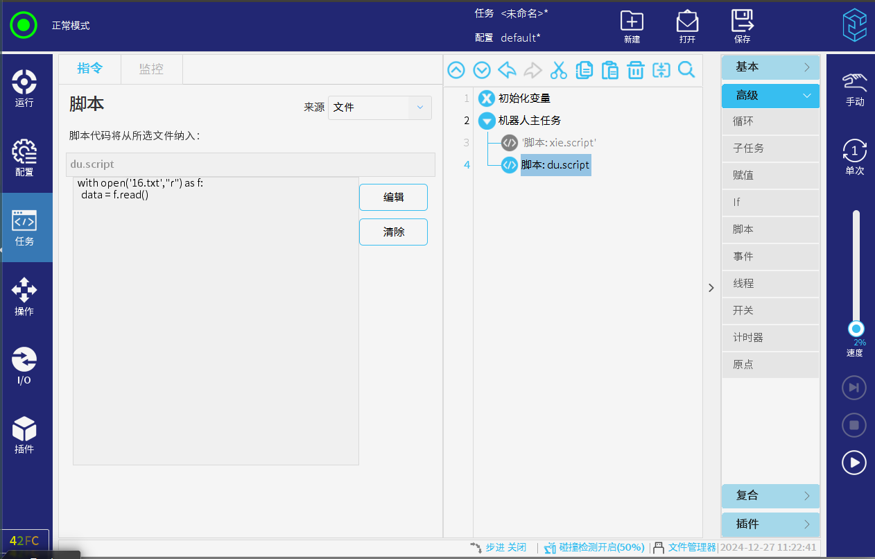 例如,用户希望对/home/elite/user/program 下的 16.txt 文件在机器人脚本中进行读写。此方法适用于软件版本 2.5 及以上!!