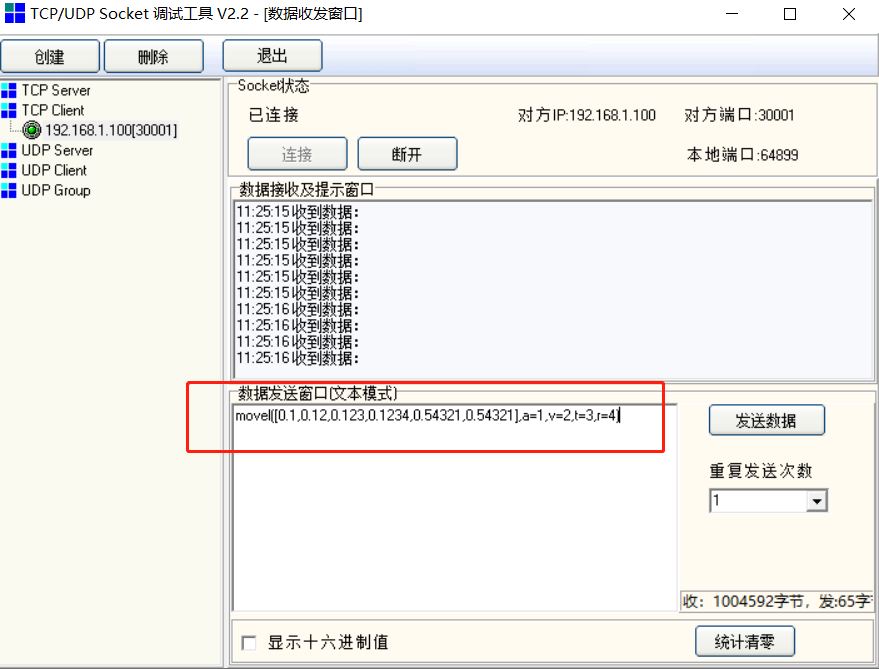 如下图使用sockettool通过30001端口发送脚本给机器人:movel([0.1,0.12,0.123,0.1234,0.54321,0.54321],a=1,v=2,t=3,r=4)