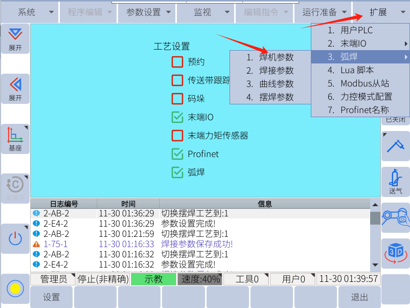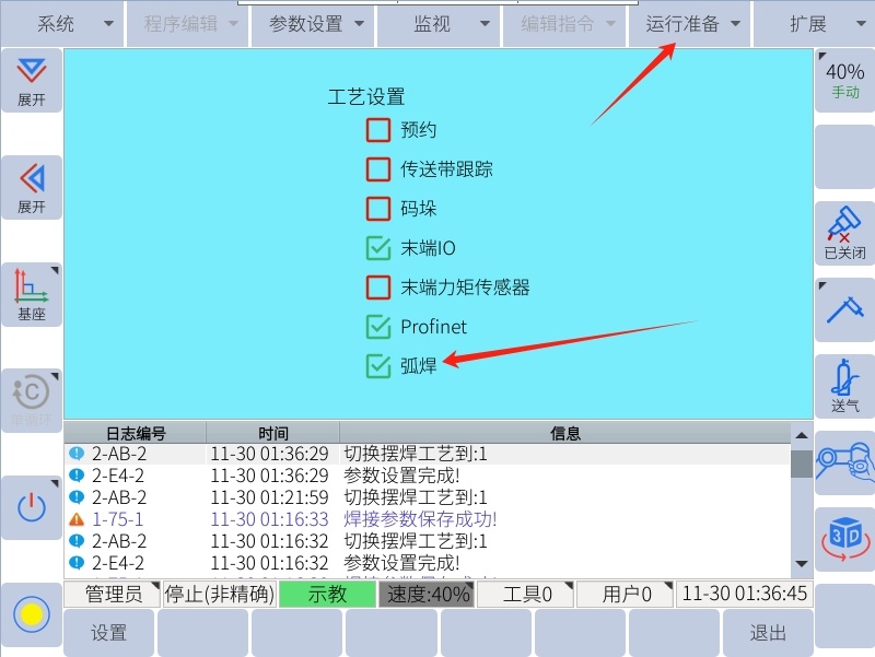 在运行准备里面勾选弧焊,然后重启机器人即可