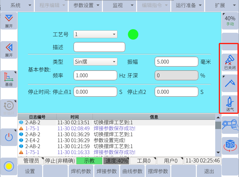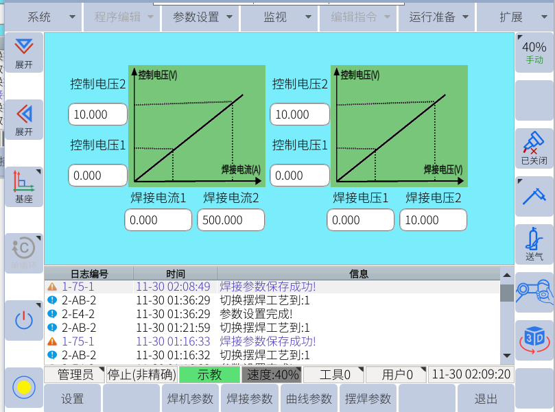 直到这个时候,焊接配置已经完成,这个时候可以点击左侧图标观察能否手动出丝,送气。