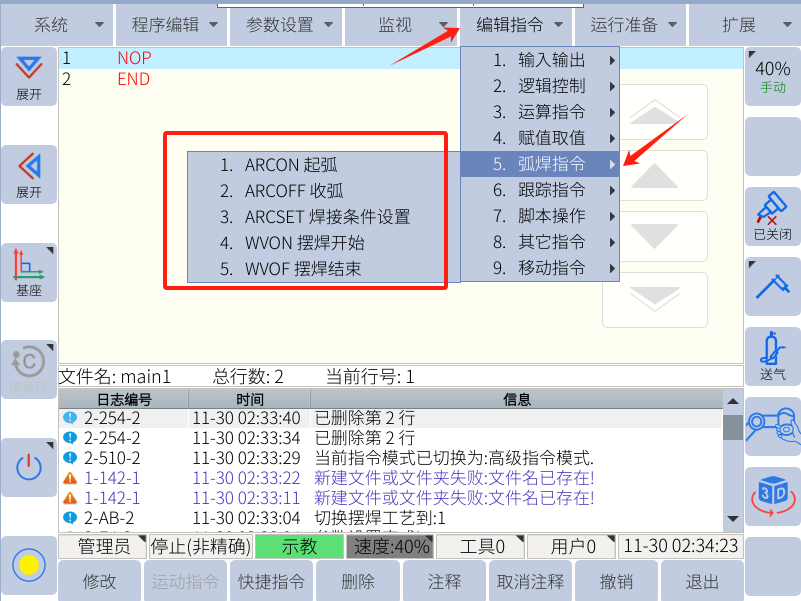 1.ARCON起弧:调用指定工艺号焊接参数中起弧的电流电压等参数。