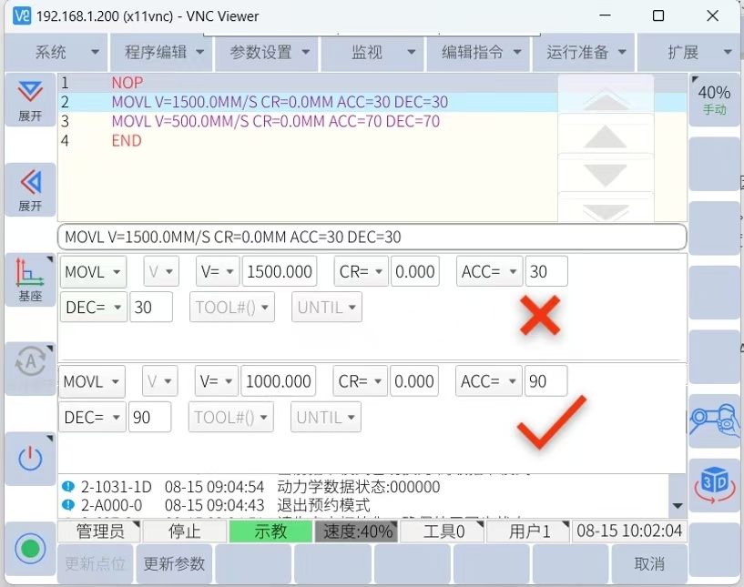 速度设置不合理会造成机械手运动不流畅,或加速度变化过大引起机器人震动,因此,在机器人速度设置中要合理,直线速度建议加速度ACC最大95 ,速度最大1500mm/s 。 建议最大关节速度VJ 95,关节加速度ACC最大95(应当根据两点距离来调整速度与加速度,才能达到最优速度)如下图所示: