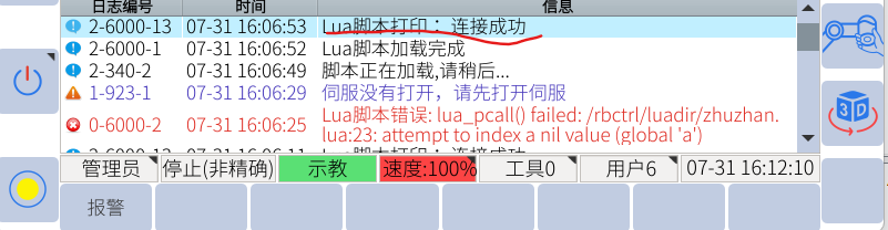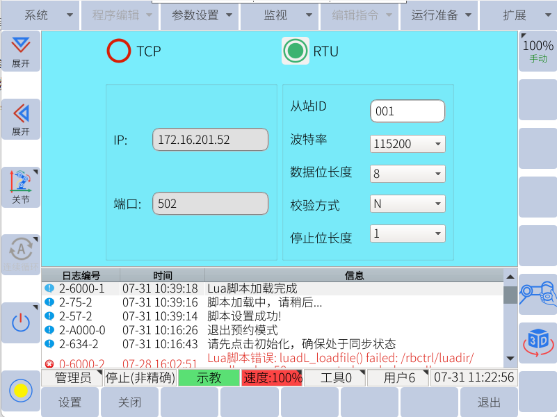 将机器人端485线接好,目前设置波特率为115200,将机器人脚本配置好,如下图所示