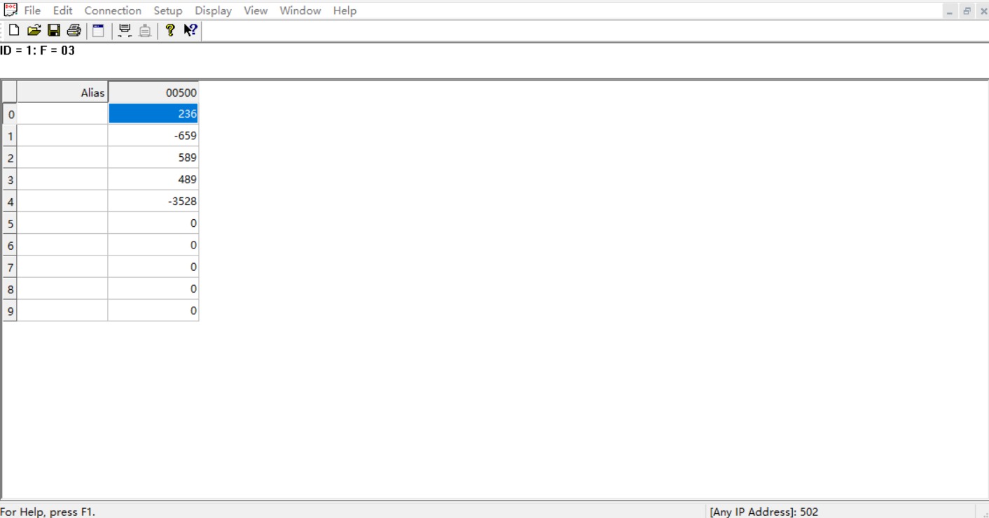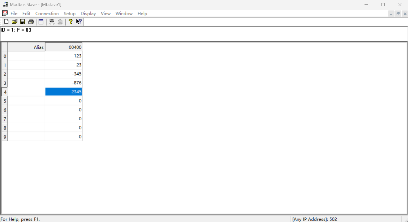 助手端将400寄存器设置为123,401寄存器设置为23,402寄存器设置为-345,403寄存器设置为-876,404寄存器设置为2345
