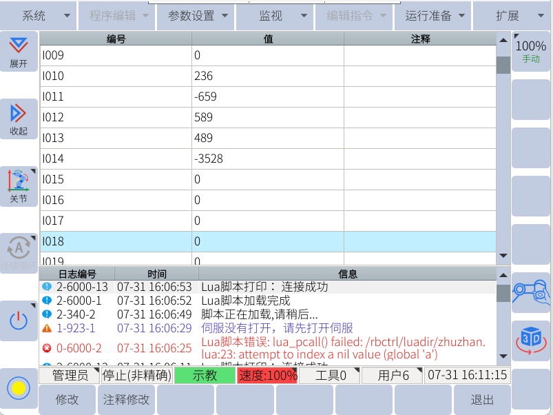 通过助手向寄存器300-304赋值,可通过示教器查看I0-I4数值,确实数值是否正确,如下图所示