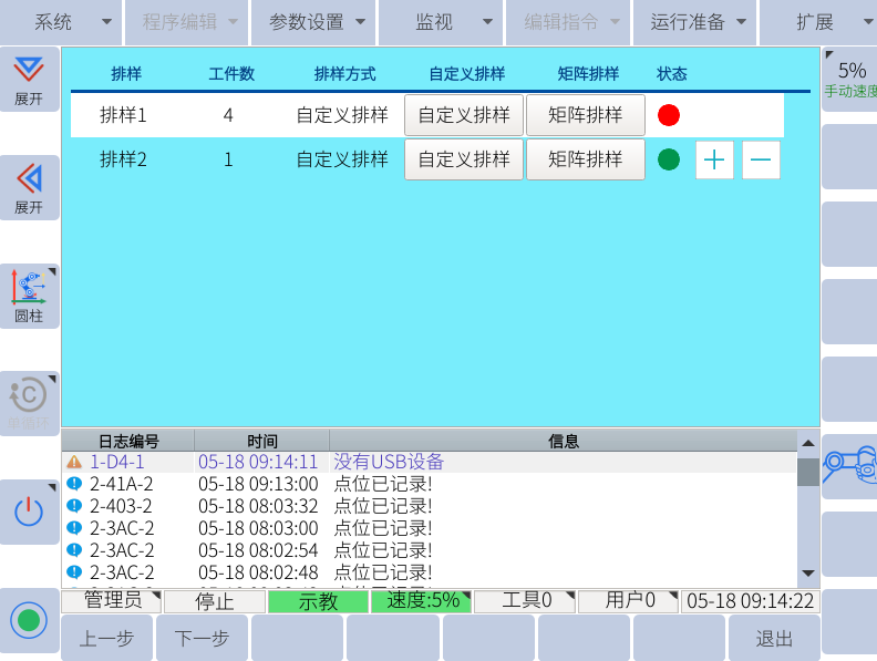 1.  进入管理员模式,选择运行准备-----8. 工艺配置-----勾选码垛,点击左下角的设置,重启后,在右上角的扩展里面会有码垛工艺配置。