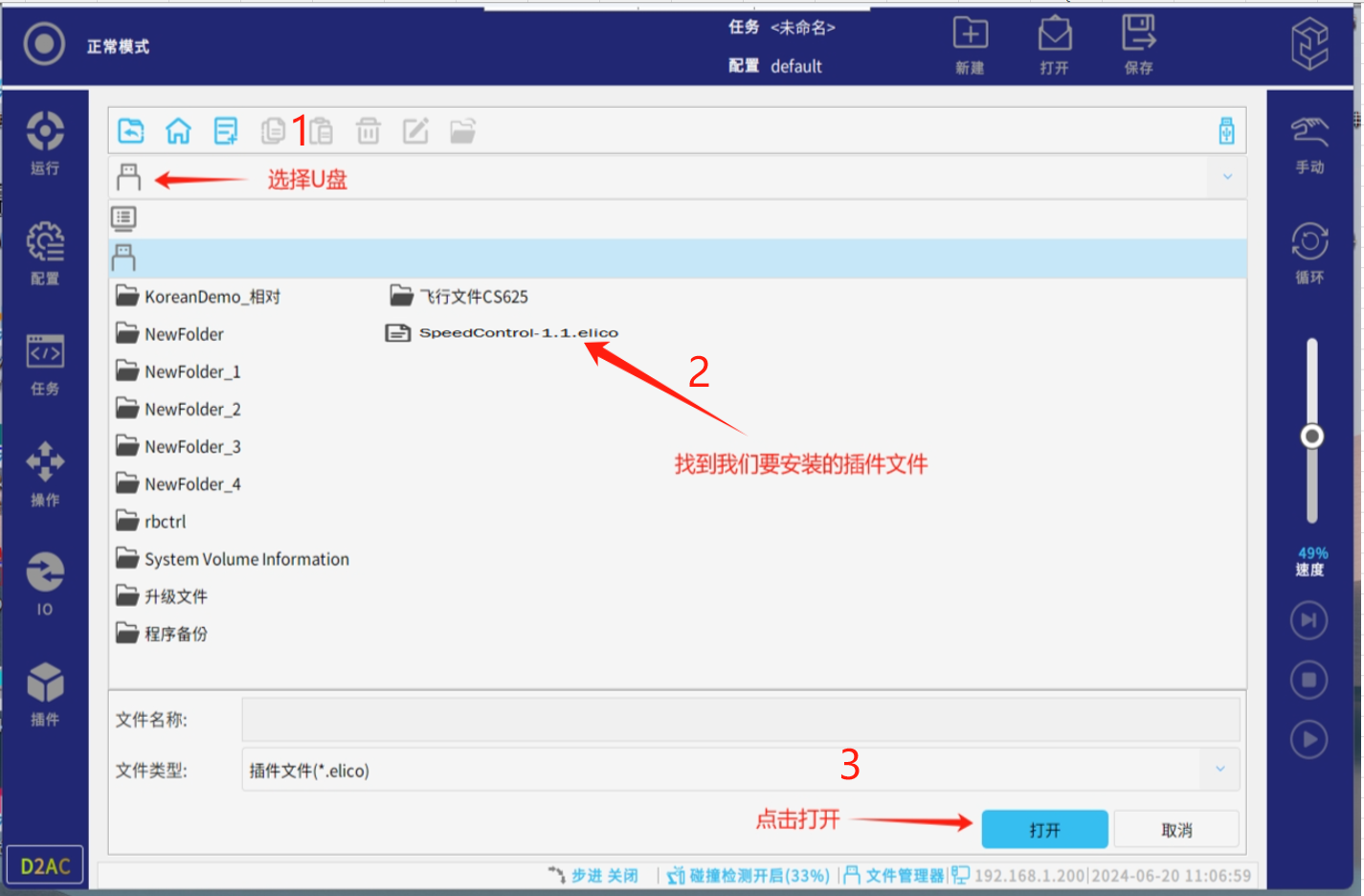 CS机器人在与外部设备进行通讯时,通常会使用机器人内部的寄存器进行信息交互,机器人自带可查看modbus寄存器,关于布尔寄存器、整数寄存器、浮点数寄存器的查看可安装寄存器监控器插件进行查看,插件文件询问艾利特人员方可获得,存放至U盘内,并插入机器人示教器或控制柜USB接口。