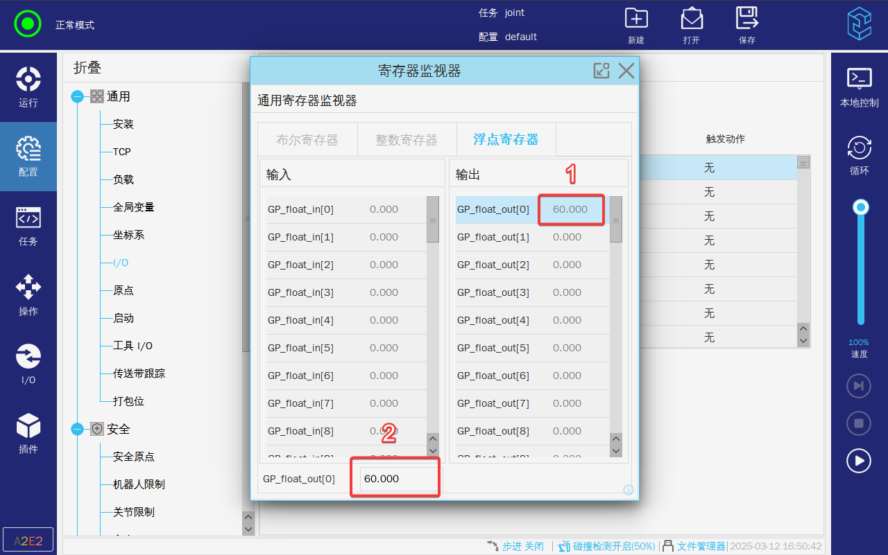 4. 浮点寄存器输入输出数量各47个,保留为总线通讯的输入输出各范围是0-23,保留范围外部RTSI客户端通讯的输入输出范围为23-47,(1)查看状态,(2)输出浮点数;