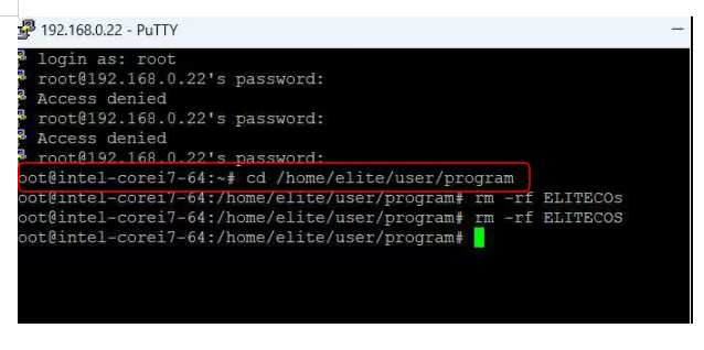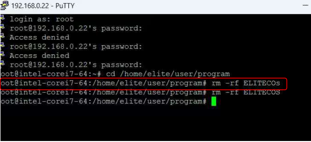 2.1通过本地PC连接到控制器,使用ssh登录的方式登录到控制器内部,删除ELITECOs文件。该方法支持任意控制软件版本下。