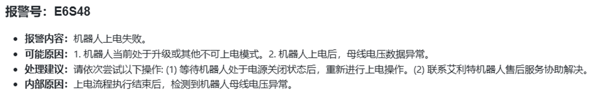 E6S48 报警所指示的是:安全系统报警,机器人上电失败。其具体释义如下: