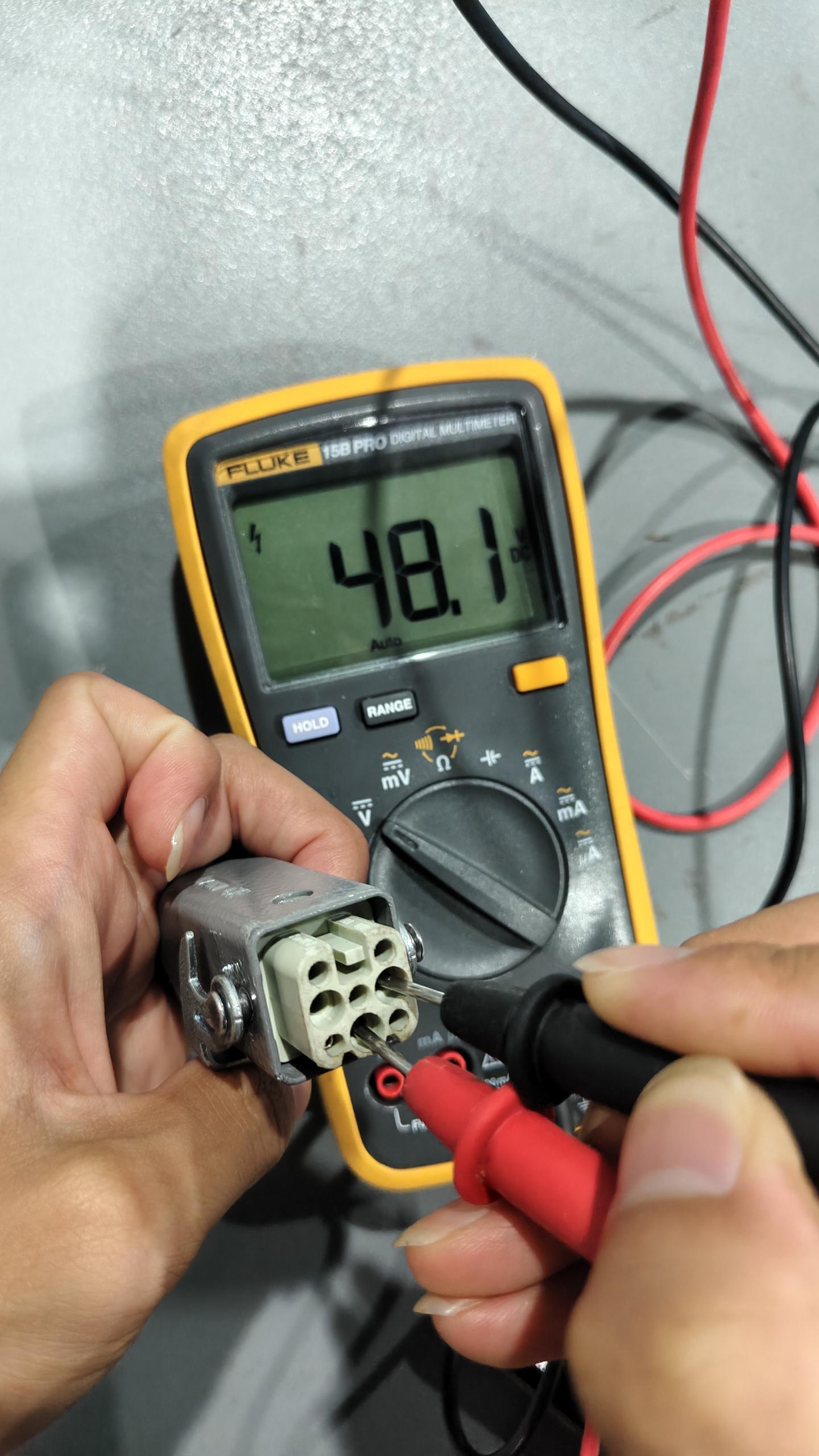 (1)断开本体,控制柜上电,打开产测48V强制上电,使用万用表测量控制柜的输出端电压,无输出可断电拆开控制柜检查内部接线有无脱落